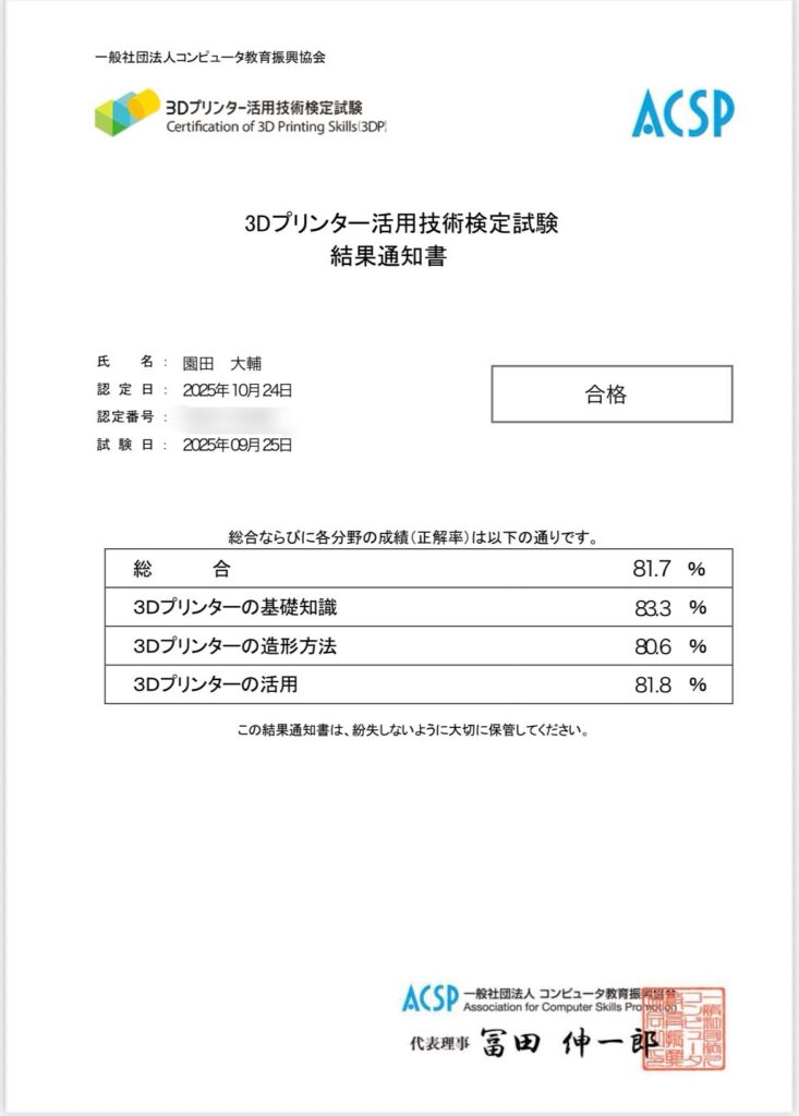 3Dプリンター活用技術検定試験、合格しました